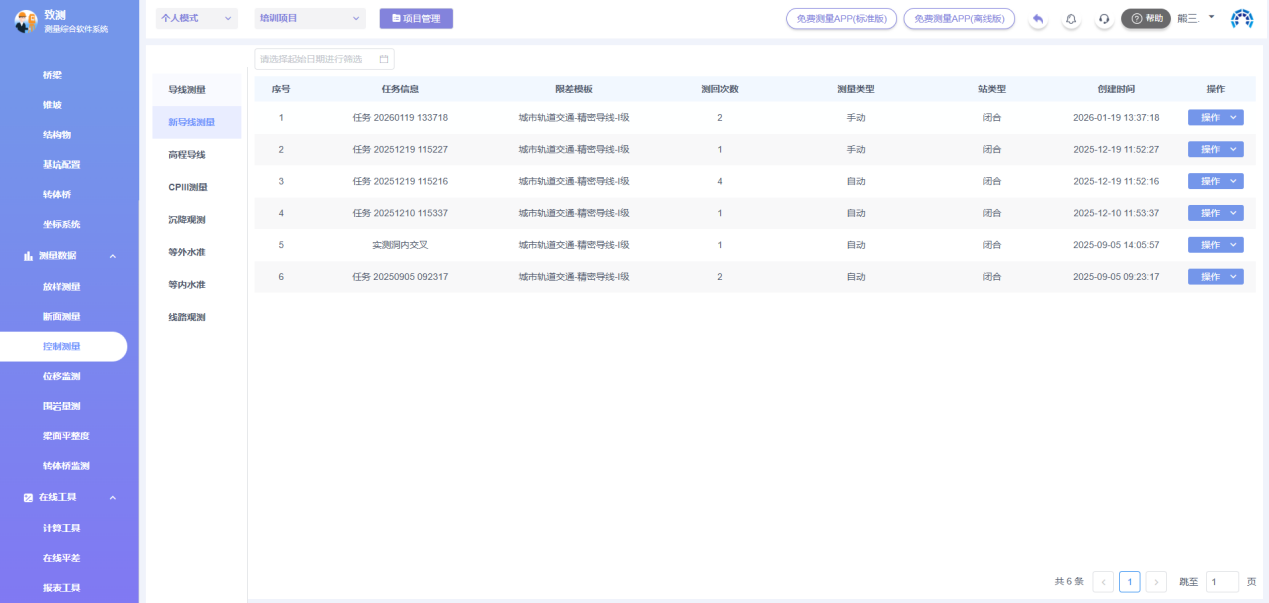 进入致测平台,左侧目录栏进入【测量数据】>【控制测量】>【新导线测量】,可查看、筛选、删除、导出导线测量报表。