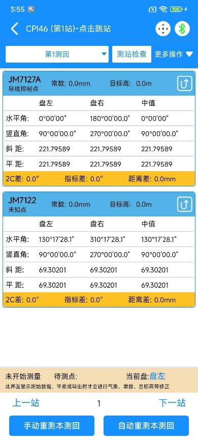 点击测站参数下方的“提交后并去测量”,进入测站测量页面后,可按测回完成观测并进行测站质量检查。