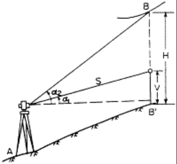 原理:仪器先测出测站点A到Bˊ的斜距和天顶距,以Bˊ作为高程起始点,瞄准B点,由全站仪直接计算出B点到Bˊ点,并加上A点到地面的距离。显示的目标高度H,由全站仪自身内存的计算程序按下式计算而得。