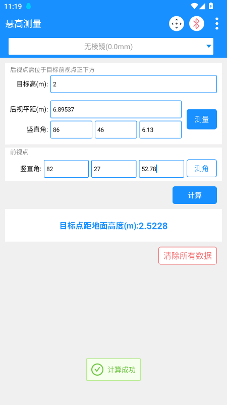 4.点击“计算”按钮,即可自动算出目标点距地面高度。计算出的数据会保存在当前界面,方便下次查看,点击“清除所有数据”可清除当前界面和已保存的数据。