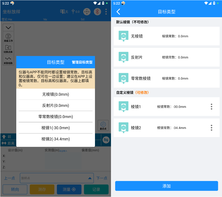注意:大部分仪器也会修正棱镜常数,所以请保证仪器和APP这两方仅设置一方的棱镜常数,另一方设置为0,避免重复修正;比如:仪器上设置了-34.4mm,则测量时APP选择棱镜常数为0;如果APP上设置了-34.4,则仪器上设置棱镜常数为0
