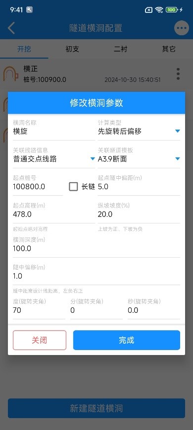 进入界面后,系统会自动弹出隧道横洞参数,选择所需放样的即可;之后如需切换,可点击下拉框手动切换。