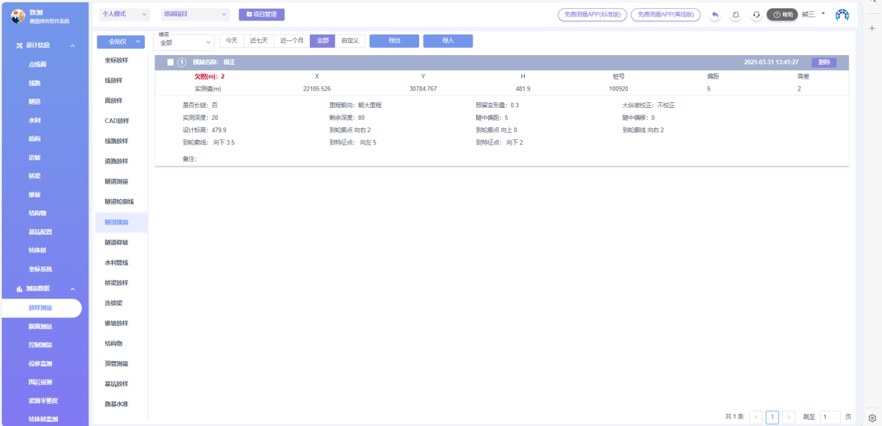 进入致测平台,左侧目录栏进入【放样测量】>【隧道横洞】,可查看、筛选、删除、导入导出放样成果数据。