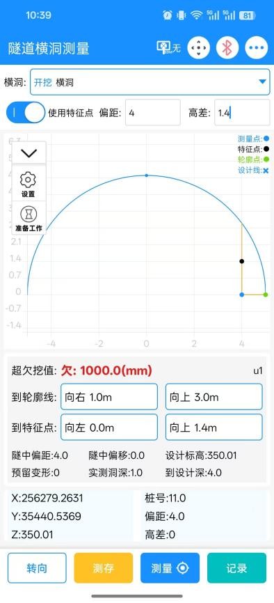 隧道横洞测量功能专为隧道辅助通道(如横通道、联络通道)的施工放样与超欠挖检测而设计。通过调用预设的横洞设计参数,本功能能计算测点与设计断面的空间关系,指导精准开挖与支护施工。