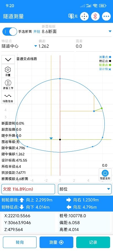 对准目标点后,点击“测量”或“测存”按钮,测量数据返回后,在界面上会显示断面、实测点、指示线等图示信息,下方会显示测量点坐标、桩号等实测信息以及超欠挖、标高等计算信息;也可手动输入坐标、桩号、偏距、高差进行计算。