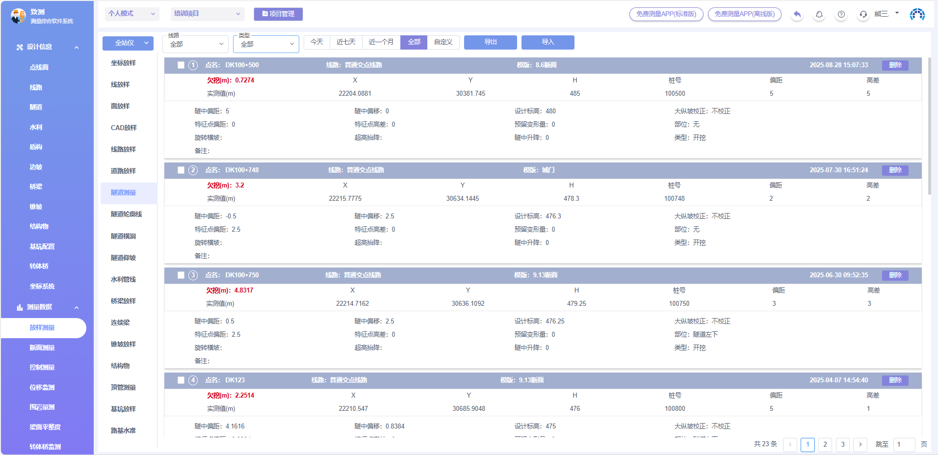 进入致测平台,左侧目录栏进入【放样测量】>【隧道测量】,可查看、筛选、删除、导出放样成果数据。