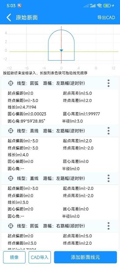 | 按起始结束坐标录入 | 以线元起点终点坐标为基础进行录入 | 适合复杂、异形等情况的断面,支持CAD导入识别 |