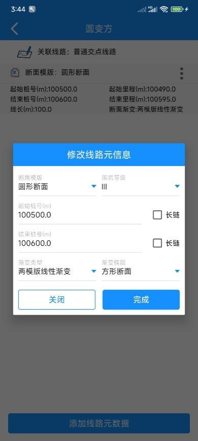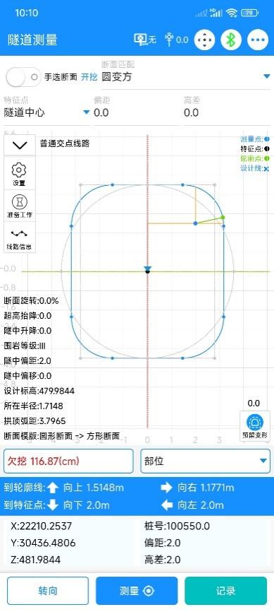 通过匹配,在实测时软件就可以根据当前实测里程,计算渐变的“量”,得到线性渐变后的新的断面模板,从而计算超欠挖等值