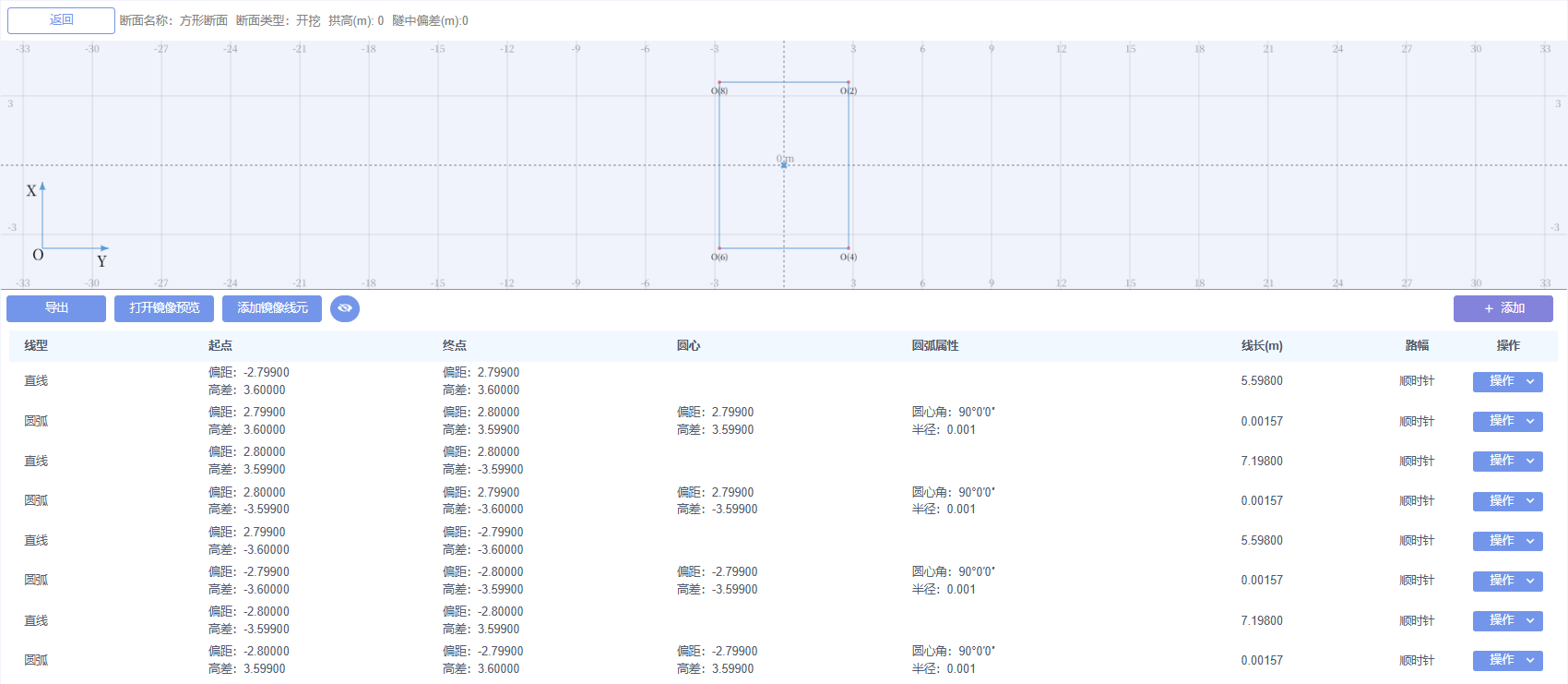 注意:此处的偏距高差和上述断面模板线元一样,按隧中为(0,0)原点录入,不需要考虑隧中偏移等;