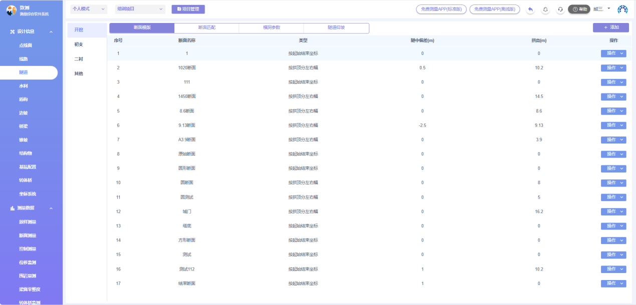 登录致测平台,在左侧目录栏进入【设计信息】>【隧道】,即可在电脑上查看、筛选、编辑、删除断面模板和断面匹配。