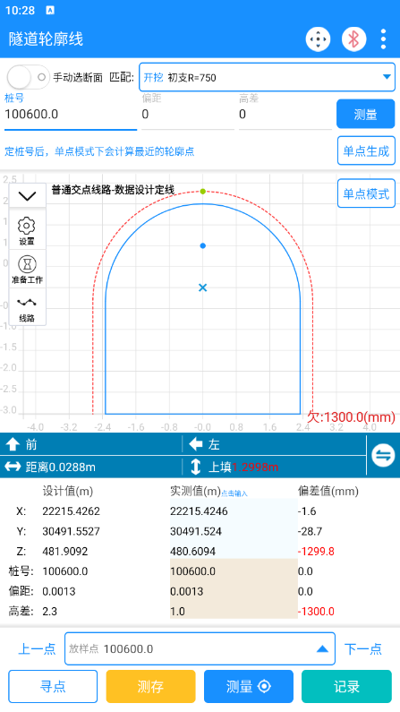 6.生成轮廓点后,点击“测量”或“测存‘按钮即可,也可手动输入坐标、桩号偏垂距计算;