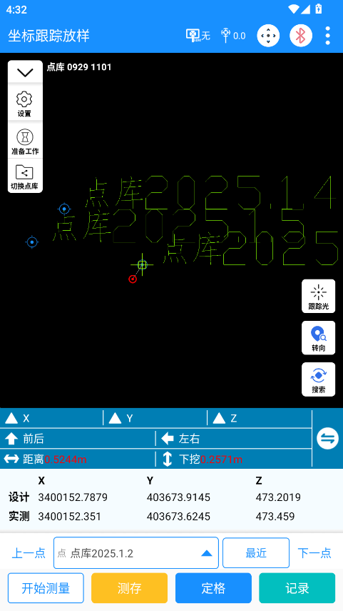 4.将仪器对准设计点,点击“开始测量”按钮,仪器开始测量获取动态数据;