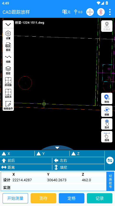4.点击“开始测量”按钮,仪器开始测量获取动态数据,点击“搜索”按钮,可自动搜寻放样点位置;