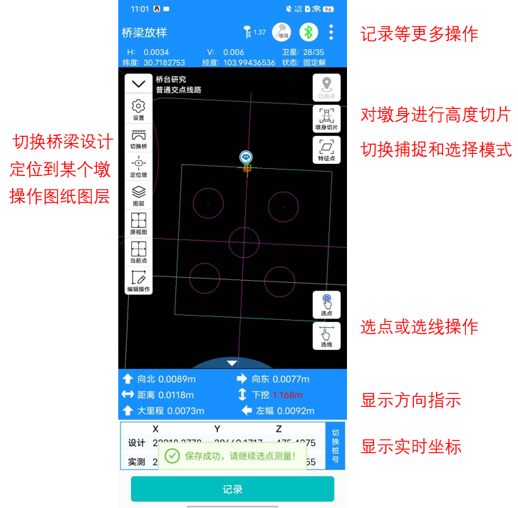 3.按照实时测量的方向指示走到设计位置,确认数据正确后,点击“记录”按钮,则本次放样数据记录成功,该点放样完成;