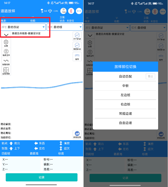 2. 进入道路放样功能,当前为平面视图页面,点击部位下拉框可以选择自动匹配、中桩、左边桩、右边桩、常规边坡不同放样部位进行切换。
