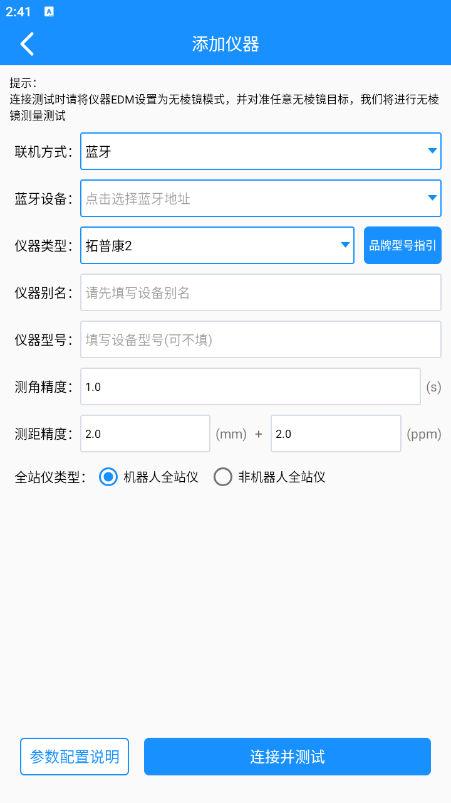 ⑤全站仪类型:根据仪器实际选择机器人全站仪或非机器人全站仪,非机器人无法使用APP自动化的部分功能;